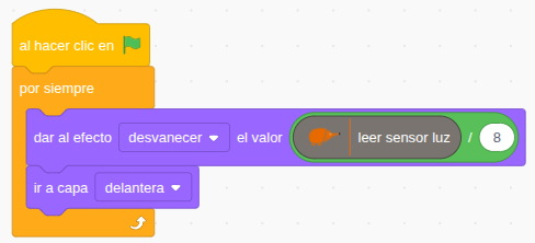 El nivel de oscurecimiento se controla mediante el efecto desvanecer, calculado con la fórmula leer_sensor_luz / 8.