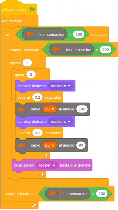 Cuando la luz sube y supera el umbral de amanecer, el gallo mueve las alas gracias al servomotor, y canta.