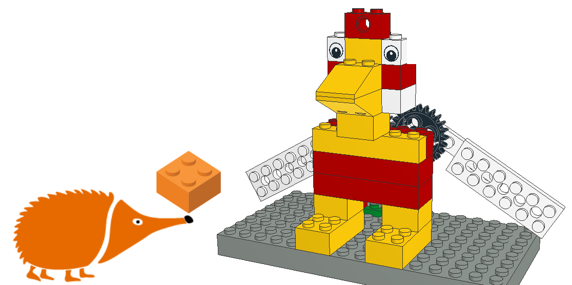 Este proyecto permite unir esa magia de los bloques de construcción con la magia de Echidna para montar un gallo mecánico que mueve las alas y canta cuando amanece.