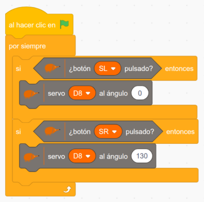 - Apertura simple mediante pulsadores: Al pulsar SL, la caja se abre. Al pulsar SR, se cierra. Un método fácil y rápido, ideal para trabajar con alumnado que está empezando. Con esta programación podrán entender el concepto de entrada digital de forma práctica.