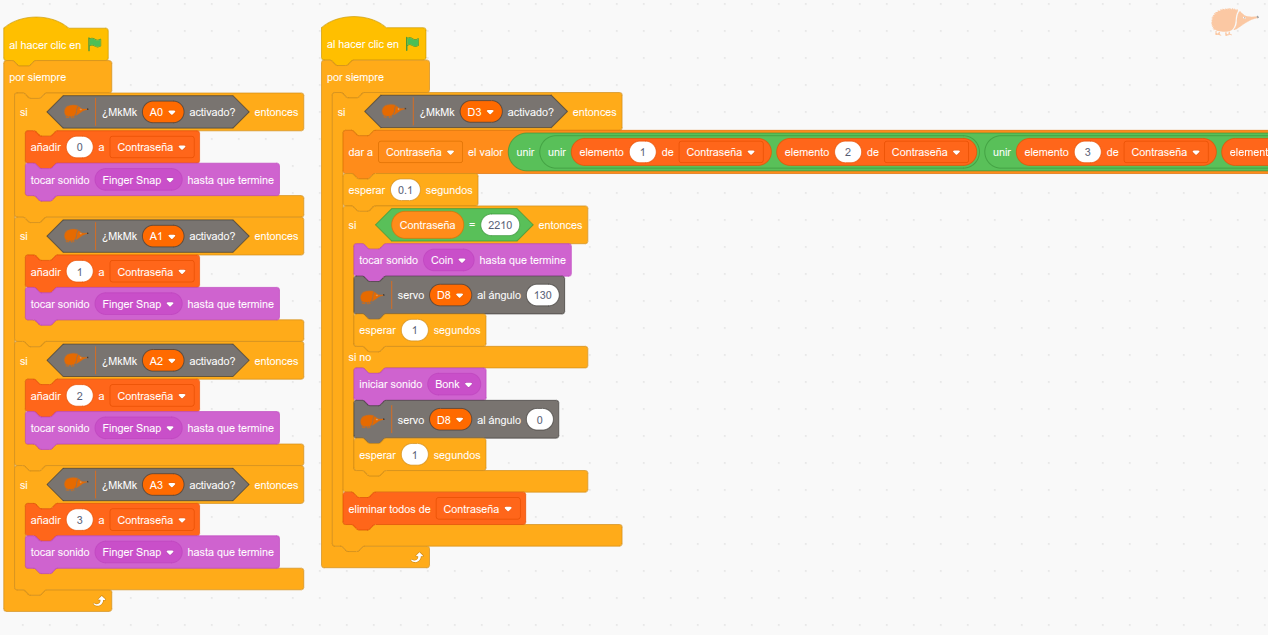 - Contraseña mediante teclado con las entradas MkMk: En este caso la apertura será mediante una lista en la que se van introduciendo números asociados a las entradas MkMk. Esta modalidad tiene la ventaja de poder trabajar conceptos más avanzados, como el de las listas, y permite crear un teclado personalizado para introducir la clave gracias a los conectores MkMk, fomentando la creatividad.